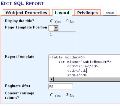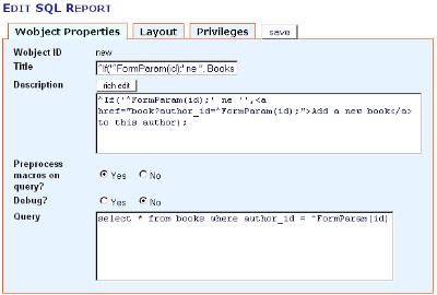 e, a causa della presenza di una macro nel codice SQL, impostiamo il flag per pre-processare le macro nella query. Per fortuna, a meno di non attivare il debug, nessun testo viene stampato se la query produce un errore e quindi, se stiamo aggiungendo un nuovo autore e quindi nessun parametro "id" è passato alla pagina, il titolo e la descrizione non appaiono grazie all' ^If; e il report non appare in quanto la query SQL da errore. Passando ora al layout di questo elemento andiamo a mettere del codice HTML simile a quello impostato nell'elemento della pagina "authors_list" Per WebGUI 5.x si usi questo codice <table border=0> <td></td> <td></td> </tr> <td>^0;</td> <a href="book?exec=edit&title=^0;&author_id=^1;">Edit</a> </td> <a href="book?exec=delete&title=^0;&author_id=^1;">Delete</a> </td> </tr>